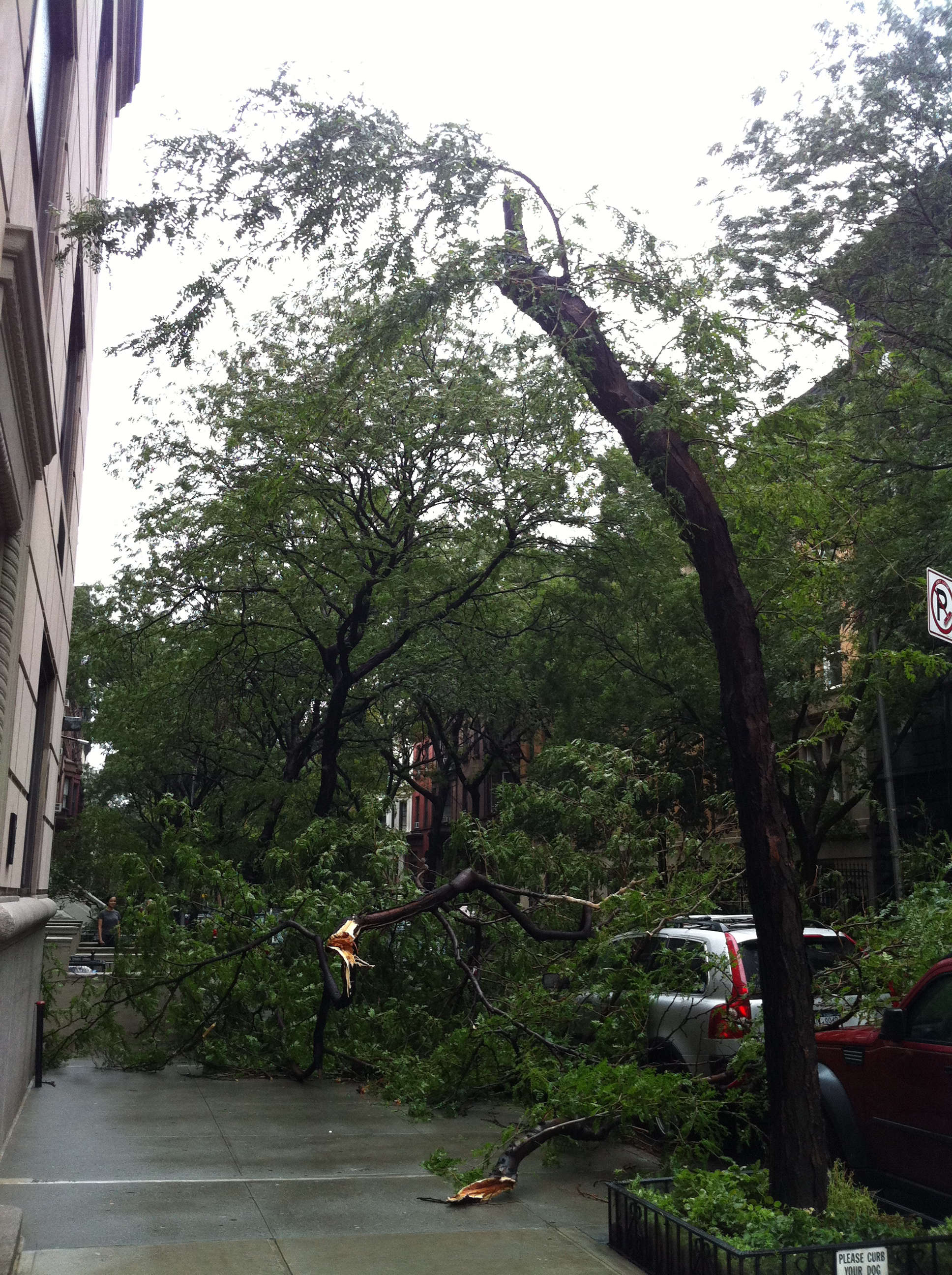 NEW YORK (GPD) – Eén voor één gaan de deuren van gebouwen weer open. Na een periode van veilige opsluiting in hun appartementen nemen New Yorkers na het passeren van orkaan Irene voorzichtig een kijkje in hun stad. Een grote tak die in een zijstraat van Central Park op twee auto’s is gevallen, is een dankbaar foto-onderwerp. ,,Voor op Facebook”, jubelt een vrouw in een paarse regenjas, terwijl ze met haar telefoon een foto neemt. Hét bewijs dat Irene in New York geen echte ramp heeft veroorzaakt.