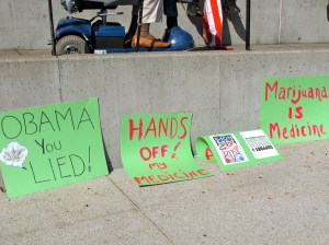Daarom stond ‘huisvrouw’ Denise Martellacci (58) deze week met een protestbord op een naar wiet geurende straathoek in San Francisco. Iets dat ze sinds de Vietnamoorlog niet meer had gedaan. President Barack Obama kwam voor een lunch met geldschieters en Martellacci wil hem laten weten dat ze teleurgesteld is. ,,Obama heeft beloofd dat hij de medische cannabis met rust zou laten. Wij hebben op hem gestemd. En nu blijkt hij te hebben gelogen.”